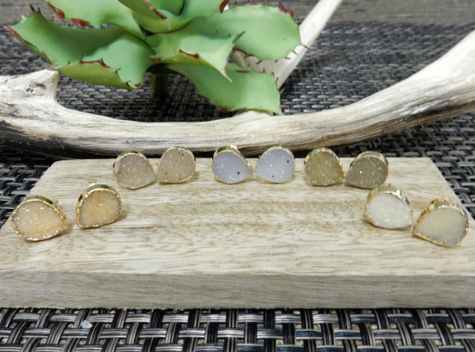 Add effortless sparkle to any look with these stunning Druzy Teardrop Stud Earrings, featuring natural druzy crystals that shimmer with every movement. Lightweight and eye-catching, they bring a touch of elegance, grounding energy, and boho charm to your style. Perfect for anyone who loves statement earrings, crystal jewelry, or unique accessories.