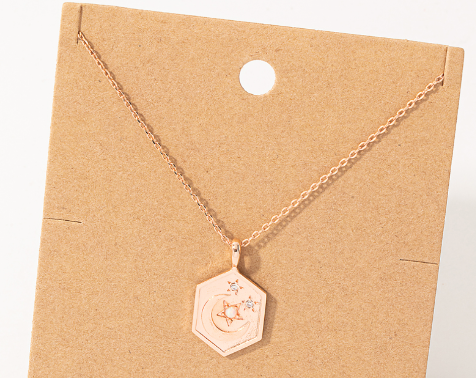 Embrace celestial style with the Hexa-Moon Necklace, featuring a unique hexagon-shaped pendant with a moon design at its center. This modern geometric piece adds a subtle, mystical touch to any outfit. Perfect for lovers of statement jewelry, boho-inspired necklaces, and celestial accessories, the Hexa-Moon Necklace looks stunning worn solo or layered.
