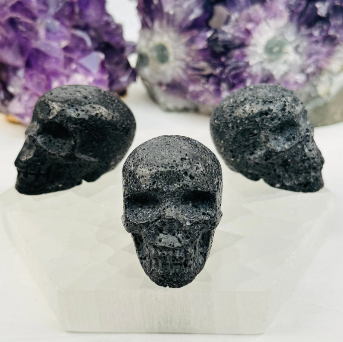 Bring bold energy and balance into your space with this Lava Stone Skull! Hand-carved from genuine volcanic rock, this piece embodies strength, transformation, and grounding power. Lava stone is known for its calming and stabilizing energy — and its porous texture makes it perfect for aromatherapy.