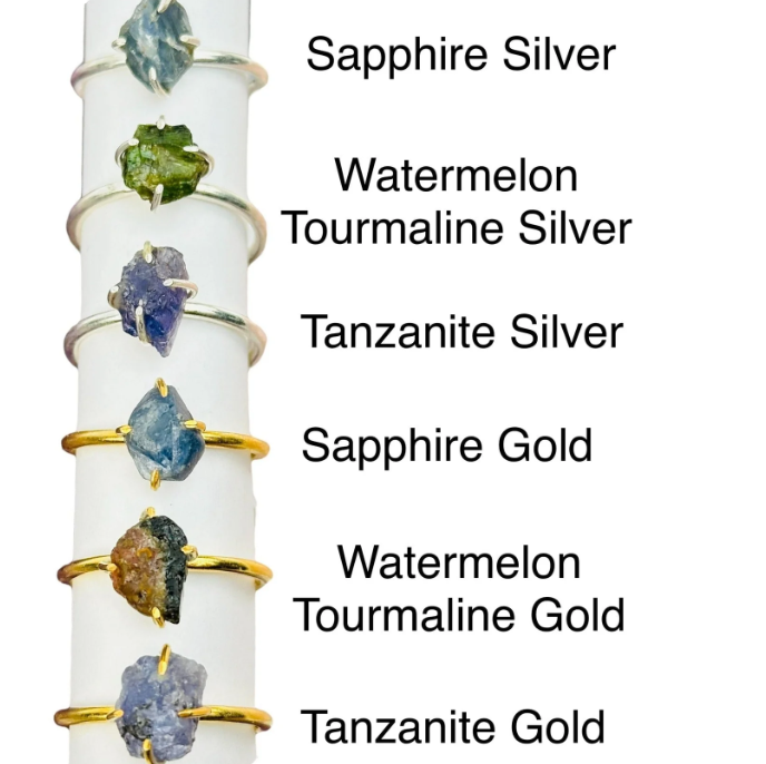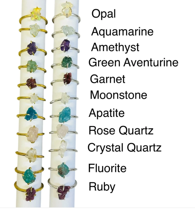 Each ring showcases one natural, unpolished crystal, highlighting its unique shape, texture, and energy and Sterling Silver.